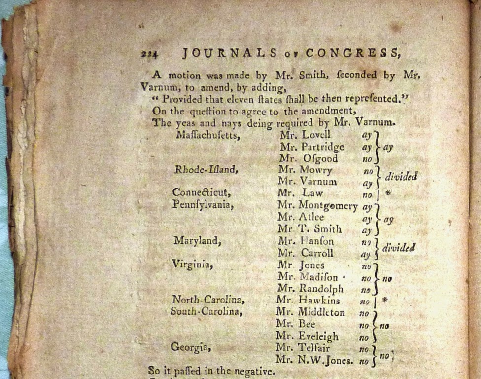 This adherence to the Articles established that the new government was indeed bound by the full authority of the Articles of Confederation. As such, it was Samuel Huntington, not John Hanson (as later claimed by Maryland), who served as the first President of the United States in Congress Assembled under the Articles of Confederation. To substantiate this, records from the Journals of the Continental Congress provide irrefutable evidence. An entry from December 24, 1778, shows a Continental Congress voting tally presided over by President Henry Laurens, in which states with only one delegate—New Hampshire, Delaware, Rhode Island, and Georgia—were allowed to cast votes. Following ratification, however, the new Congress strictly adhered to Article V, barring states with fewer than two delegates from casting votes. |